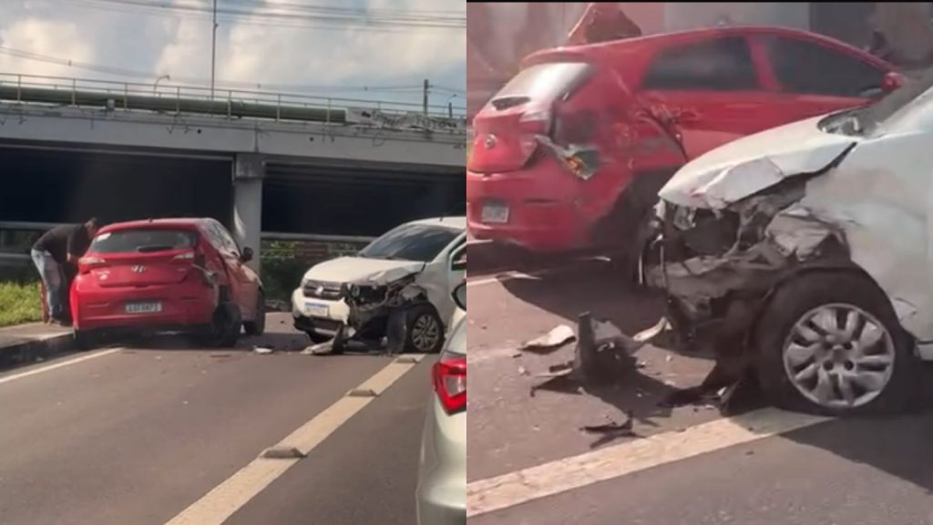 Um acidente envolvendo dois carros na manhã desta quinta-feira (4) causou lentidão no trânsito, na avenida das Flores, em Manaus. No vídeo, que circula nas redes sociais, os veículos aparecem atravessados no meio da avenida.