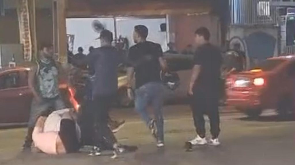 As imagens mostram dois homens trocando socos no chão enquanto um grupo de quatro pessoas ficam assistindo a cena.