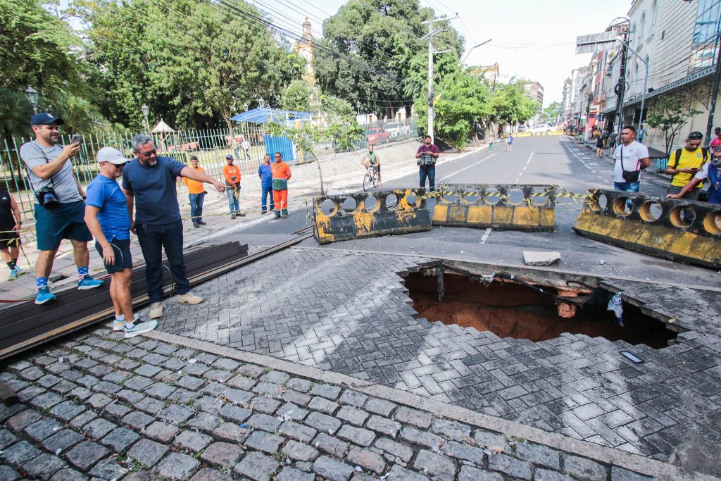 Manaus (AM) – Um enorme buraco abriu na manhã desta quinta-feira (14), na antiga Galeria dos Ingleses do século 19 quando se rompeu e causou o afundamento no cruzamento com a avenida Eduardo Ribeiro.