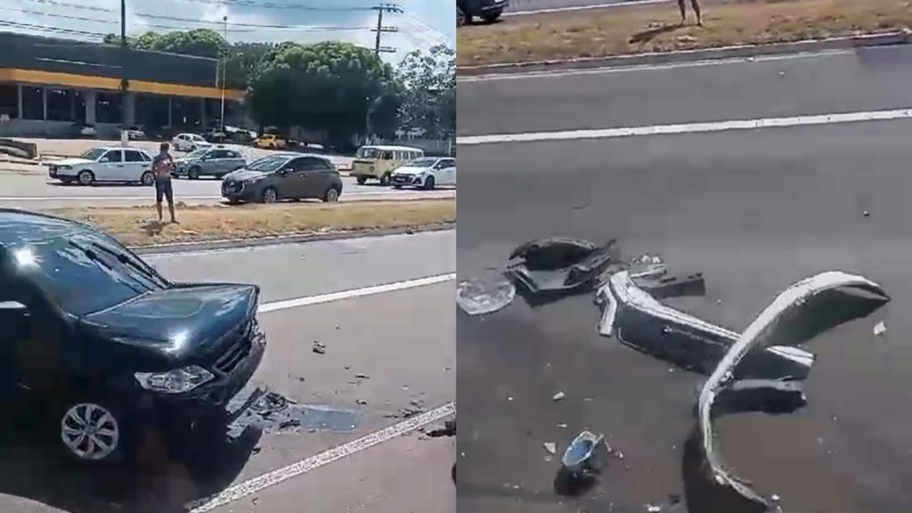 De acordo com testemunhas, um carro de cor preta foi fechado por uma picape, que atingiu a lateral do veículo. Não há mais informações sobre o acidente.