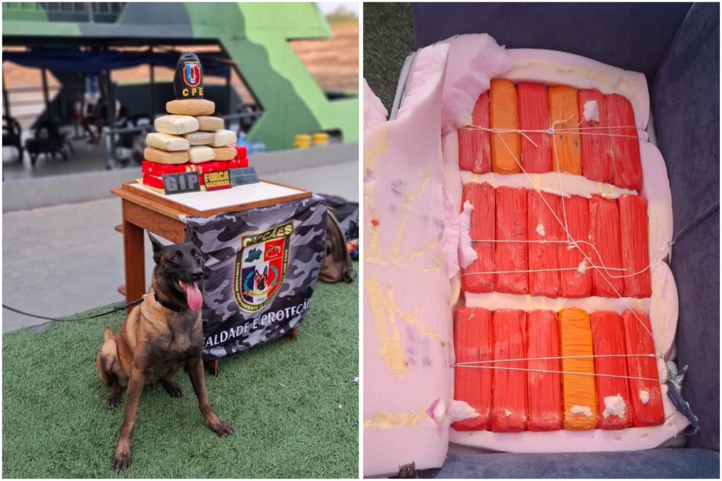 Já em outra apreensão às 6h30, a embarcação F/B Esmeralda, também oriunda do município de Tabatinga, passou pela revista dos policiais da Base Arpão I. Durante a ação, a cadela Havana sinalizou que no interior de dois sofás que se encontravam no convés principal e estava descrito como encomenda, foram encontrados 18 tabletes de pasta base de cocaína e nove tabletes de maconha do tipo skunk.