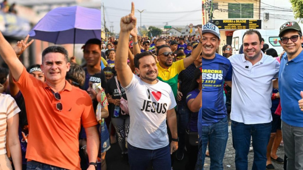 Os candidatos à Prefeitura de Manaus, David Almeida (Avante), Roberto Cidade (UB) e Alberto Neto (PL), tentam conquistar os votos dos fiéis nas eleições municipais de 2024.