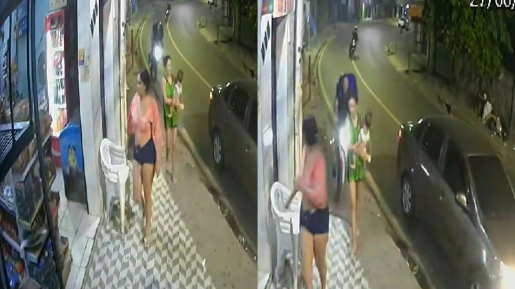 Nas imagens, a mulher aparece caminhando pela calçada com a criança quando é atingida pelo motociclista, que estava em alta velocidade.