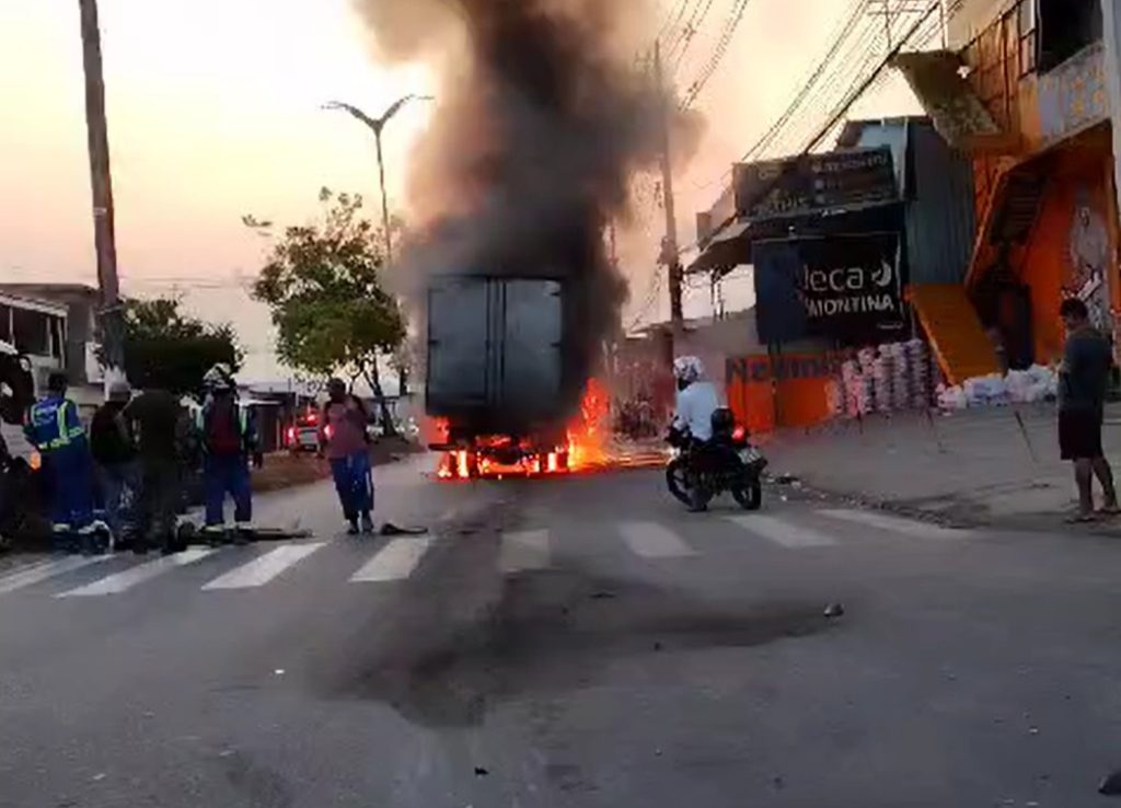 Um caminhão pegou fogo após se envolver em um acidente com um carro e uma motocicleta, nesta quarta-feira (25), na avenida Sete de Maio, bairro Santa Etelvina, Zona Norte de Manaus. Um homem ficou gravemente ferido.