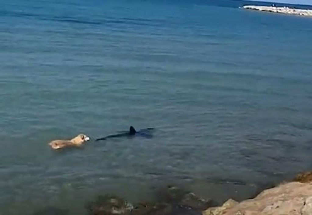 O cachorro foi ignorado pelo tubarão e voltou para a praia. As imagens foram gravadas no último domingo (22) em Dénia, região costeira de Valência, na Espanha.