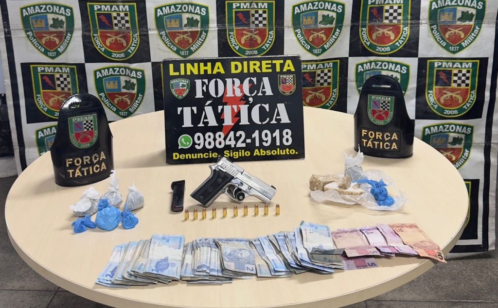 Um homem de 27 anos foi preso na madrugada deste sábado (11), ao ser flagrado com drogas e arma de fogo no Centro de Manaus.