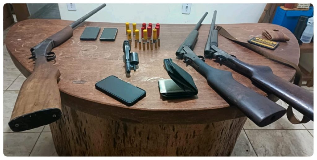 Já no local, os PMs apreenderam uma espingarda calibre 16 com cinco cartuchos, uma espingarda calibre 20 com seis cartuchos e uma espingarda calibre 32 com um cartucho, todos intactos.