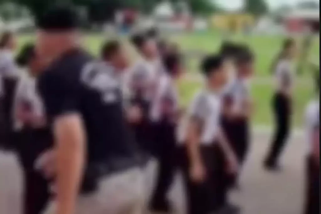 No vídeo divulgado nas redes sociais, os alunos marchavam pelas ruas da cidade, conduzidos por um policial que liderava a atividade extracurricular realizada na quinta-feira (21).