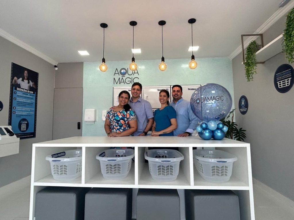 Para concretizar essa ideia, Larissa, junto com seu marido Mateus Said (casal à esq.) e seus cunhados Pedro Henrique e Janaina, decidiu investir em um modelo de lavanderia automatizada, algo ainda inédito na cidade.