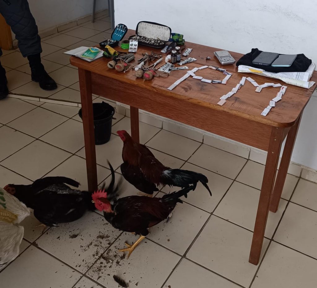 A companheira de um dos suspeitos autorizou os policiais militares a entrarem na residência, onde foram localizados três galos, materiais utilizados para preparo dos animais para rinhas, e um livro com páginas recortadas, cujos pedaços eram compatíveis com os invólucros usados na embalagem da droga.