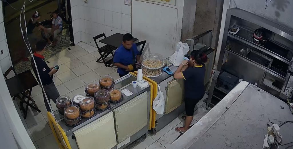 Nas imagens, o homem aparece sentado em frente ao estabelecimento quando é abordado por dois suspeitos em uma motocicleta. O garupa desce, anuncia o assalto e tenta roubar o celular da vítima. Ao se recusar a entregar o aparelho, o homem sai correndo, e o criminoso dispara, mas erra o alvo.