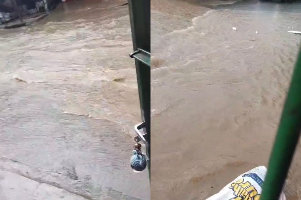 Pela gravação, é possível ver que a água não chegou a invadir nenhum comércio, mas comprometeu o trânsito de pedestres na via pública.