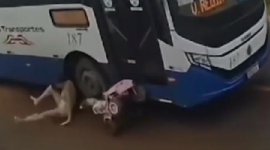Uma jovem de 27 anos estava empurrando o carrinho com sua filha de 2 anos, quando tentou desviar de um buraco na rua e acabou sendo atingida por um ônibus coletivo em Várzea Grande, região metropolitana de Cuiabá. Apesar do susto, ambas saíram sem ferimentos. O momento do acidente foi registrado por uma câmera de segurança.