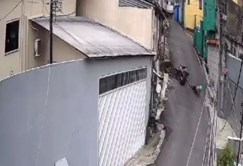 Nas imagens, é possível ver o momento em que o casal sobe a ladeira e, ao empinar a moto, perde o controle, resultando na queda. Apesar do impacto, ambos conseguiram escapar sem ferimentos.