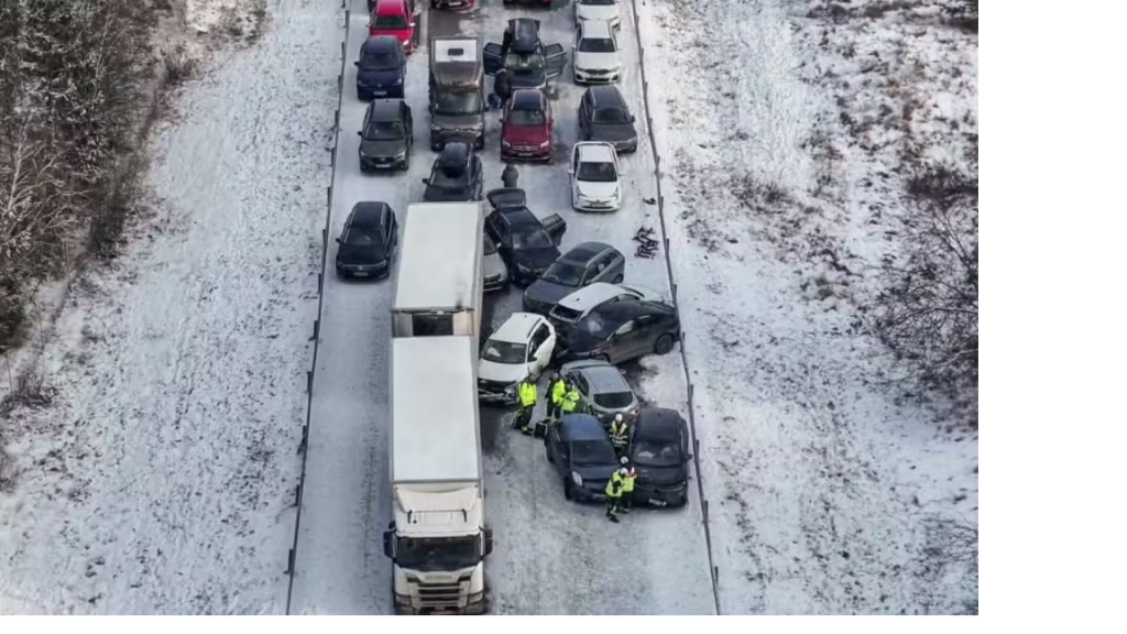 Um engavetamento causado por nevasca na Suécia, no que foi descrito por um porta-voz da polícia como uma “cena de filme distópico”, envolveu 95 veículos na tarde de sábado (15).