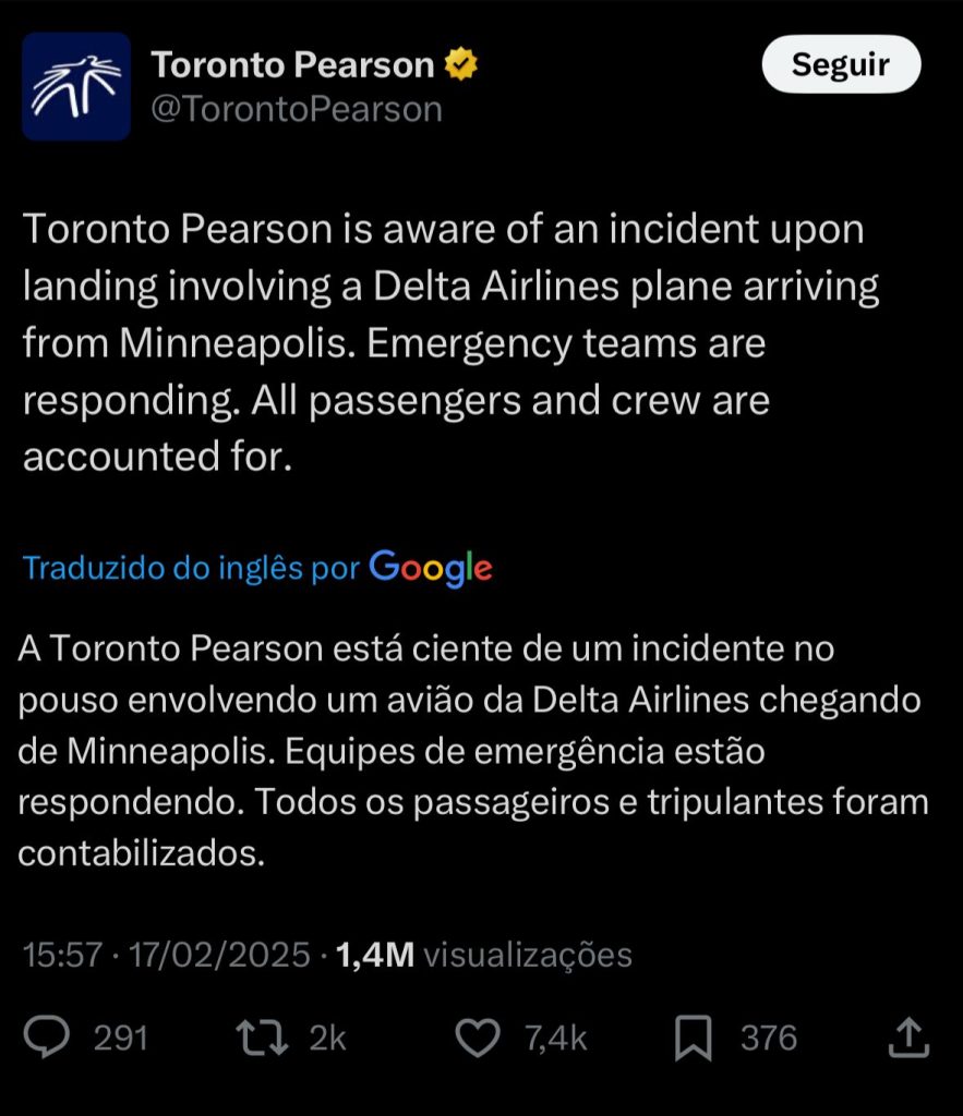 O aeroporto Toronto Pearson confirmou, por meio das redes sociais, que o acidente envolveu um avião da Delta Airlines, que fazia o voo DL4819 vindo de Minneapolis, nos Estados Unidos.