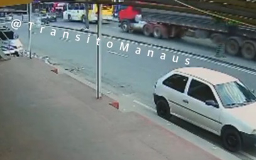 Manaus (AM) – Um vídeo divulgado pela página Trânsito Manaus mostra o momento em que um ônibus da linha 080 do transporte coletivo urbano de Manaus foi fechado por uma carreta e bateu na traseira de um caminhão, na manhã desta quinta-feira (28). O acidente aconteceu na alameda Cosme Ferreira, no bairro Zumbi dos Palmares, na Zona Leste.