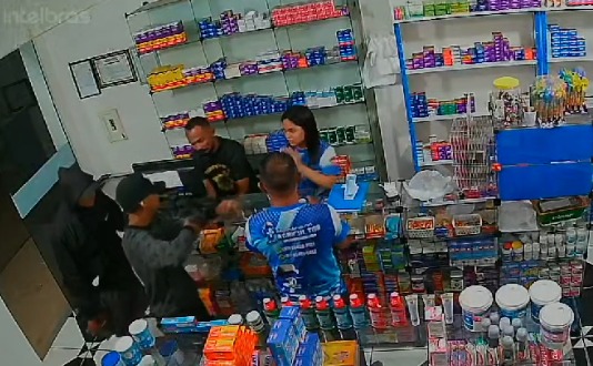 Nas imagens, a dupla chega em uma motocicleta e surpreende três funcionários que estão dentro da farmácia. A dupla entra no local e ameaça as vítimas com uma arma.