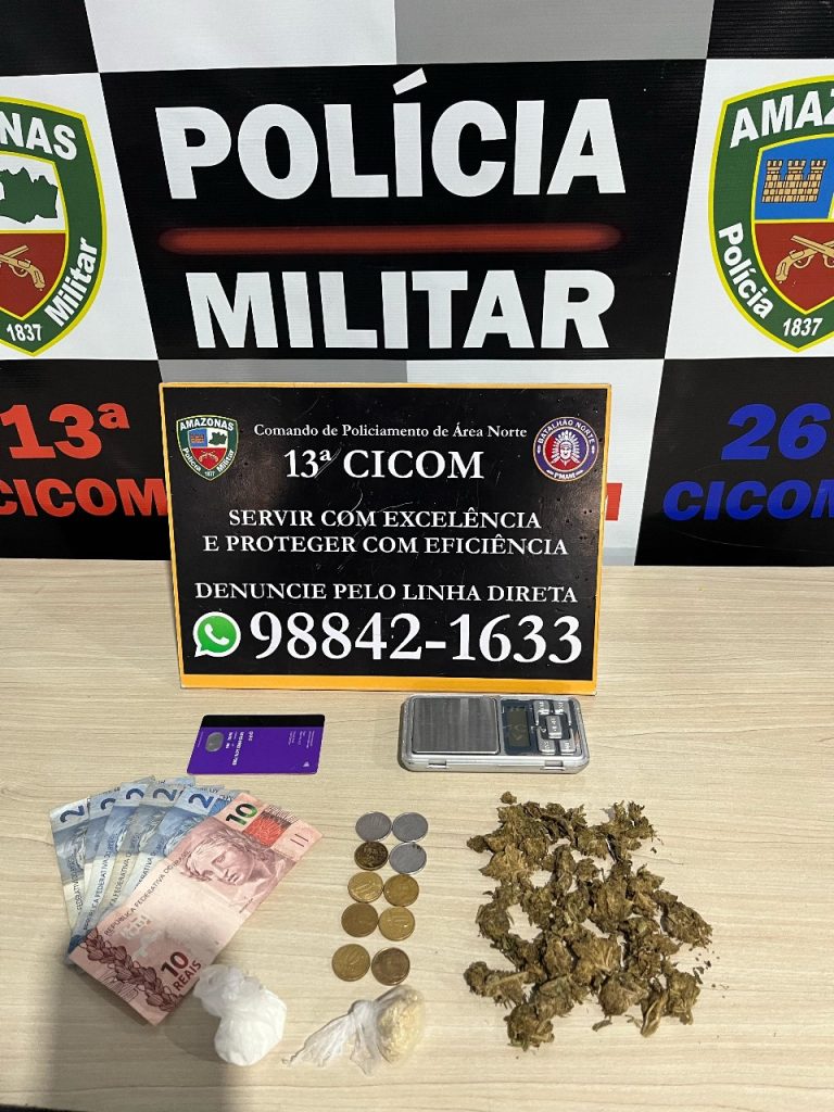 Um foragido da Justiça, de 22 anos, foi preso no momento em que vendia drogas na rua Salmon, localizado na comunidade Alfredo Nascimento, bairro Cidade de Deus, Zona Norte de Manaus, durante o sábado (8).