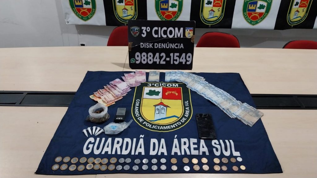 Com ele foi encontrado uma bolsa vermelha e dentro dela estava guardado cinco pinos de cocaína, duas trouxas médias de maconha, uma trouxa de pasta base, uma balança de precisão, um celular e R$ 170,75 em espécie. O homem e o material apreendido foram levados ao 1º Distrito Integrado de Polícia (DIP).