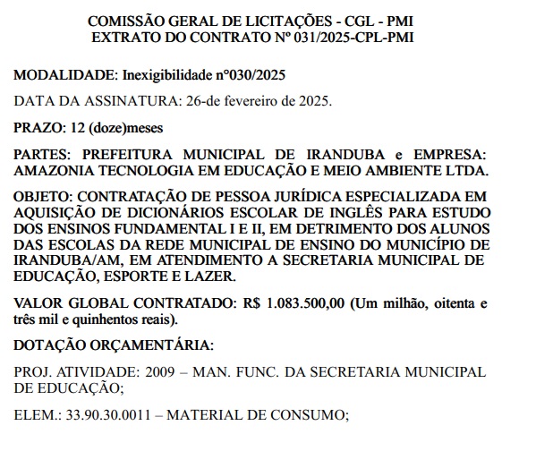O prefeito de Iranduba, a 36 quilômetros de Manaus, Augusto Ferraz (União Brasil), dispensou um processo licitatório para contratar a empresa Amazônia Tecnologia em Educação e Meio Ambiente Ltda. O valor do contrato ultrapassa R$ 1 milhão e tem como objetivo a aquisição de dicionários de inglês para alunos do ensino fundamental I e II da rede municipal.