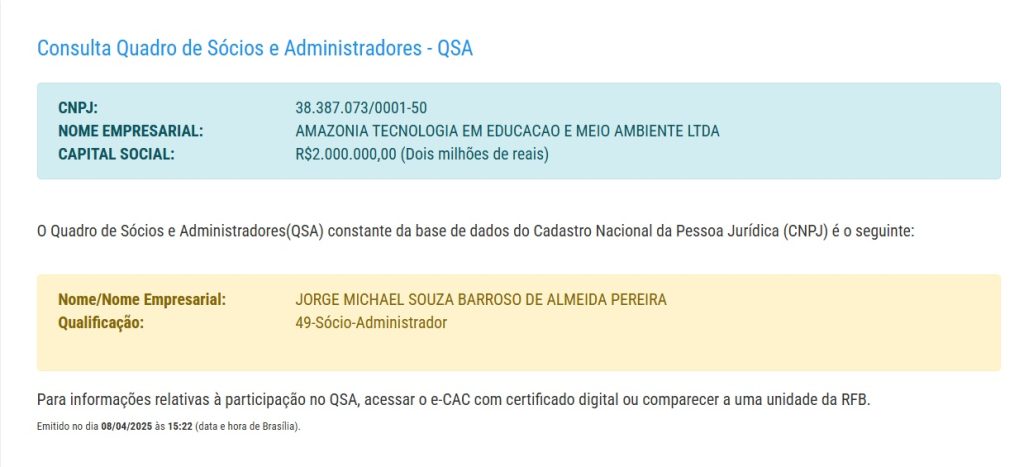 Conforme dados da Receita Federal, a Amazônia Tecnologia em Educação e Meio Ambiente Ltda., inscrita no CNPJ 38.387.073/0001-50, tem capital social de R$ 2 milhões.