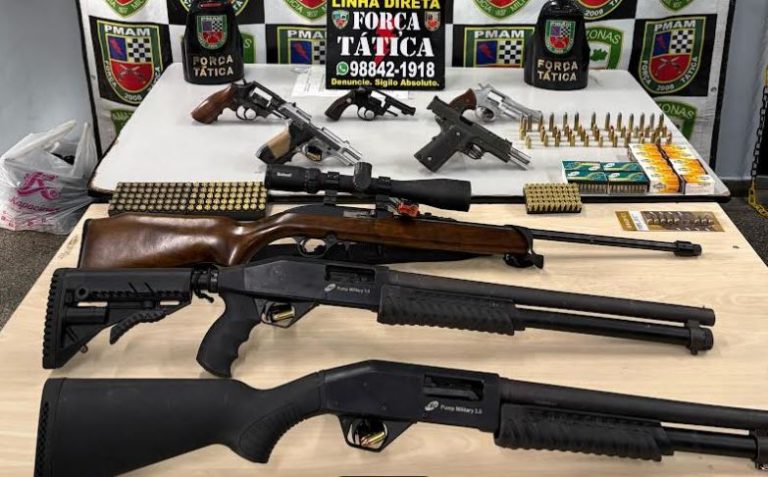 A Força Tática, apreendeu um arsenal de armas de fogo, na tarde de sexta-feira (11), em uma residência na rua 71, no bairro Novo Aleixo, zona norte de Manaus. A apreensão ocorreu após uma denúncia de violência doméstica feita ao vivo por uma mulher, durante a transmissão de um programa de televisão.