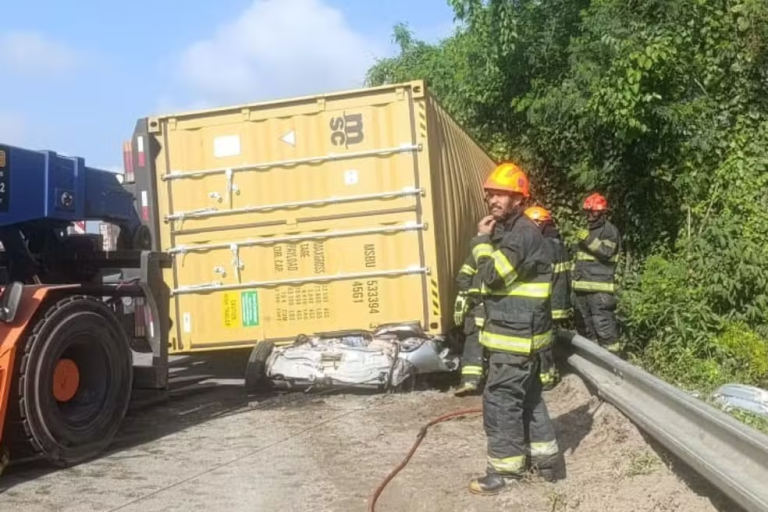 O caso ocorreu, na altura do km 286, na pista sentido Praia Grande, por volta das 8h40. De acordo com o Corpo de Bombeiros, o carro com os três ocupantes estava estacionado no acostamento quando foi atingido pelo contêiner.