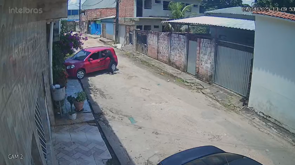 Pelas imagens, é possível ver que a rua está pouco movimentada. A motorista desce do carro vermelho, modelo Uno, placa NOT 5248, para abrir o portão do imóvel, e nesse momento, o suspeito se aproxima. Com a distração da condutora, ele entra no carro e parte em disparada.