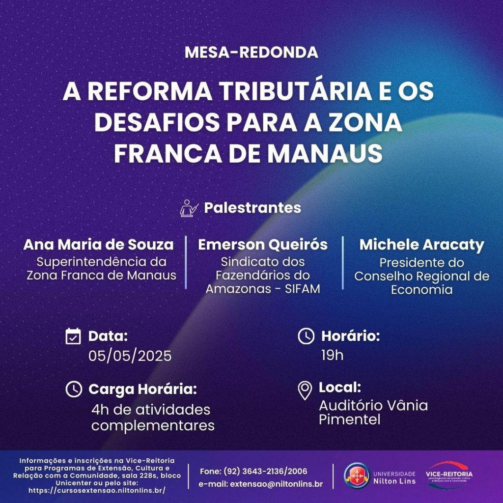 Manaus (AM) – Fruto de parceria entre o Conselho Regional de Economia (Corecon-Am/RR) e a coordenação do curso de Economia da Universidade Nilton Lins, na próxima segunda-feira (5/5), acontecerá a mesa redonda “A Reforma Tributária e os Desafios para a Zona Franca de Manaus”.