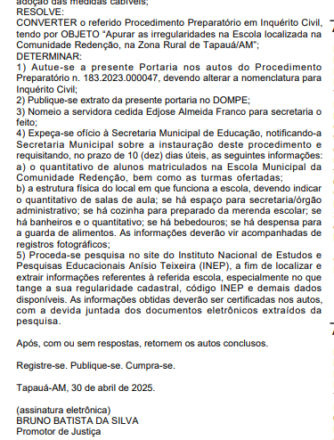 A instauração do inquérito foi formalizada por meio da Portaria nº 2025/0000074844.01PROM_TAP, assinada pelo promotor de Justiça Bruno Batista da Silva, no dia 30 de abril. O procedimento decorre da conversão do Procedimento Preparatório nº 183.2023.000047, diante do encerramento do prazo previsto na Resolução nº 006/2015 do Conselho Superior do Ministério Público (CSMP) para sua tramitação.