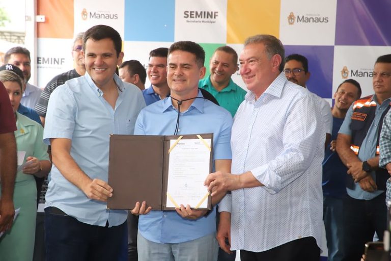 A Prefeitura de Manaus deu início, nesta quinta-feira (8), às obras de recapeamento asfáltico em 20 ruas da comunidade Parque Riachuelo, localizada no bairro Tarumã, zona Oeste da capital. O prefeito David Almeida assinou a ordem de serviço ao lado do vice-prefeito e titular da Secretaria Municipal de Infraestrutura (Seminf), Renato Junior, do deputado federal Átila Lins — responsável pela emenda parlamentar de R$ 8,2 milhões que viabiliza as obras — e da presidente da comunidade Cidadão 10, Suzy Santos.