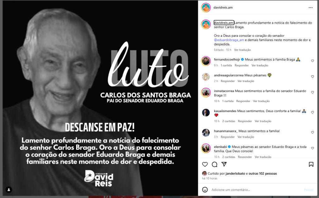 “Recebi com grande tristeza a notícia do falecimento do senhor Carlos Braga, pai do senador Eduardo Braga. Tive o privilégio de conhecê-lo antes mesmo de ingressar na política. Sempre tive um carinho profundo e sincera admiração por seu Carlos — um homem íntegro, generoso e exemplo de dedicação à família”, declarou o prefeito.