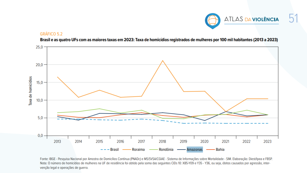 Manaus (AM) – Em 2023, o Amazonas apresentou uma taxa alarmante de 5,9 homicídios femininos por 100 mil mulheres, colocando o estado entre as maiores taxas de violência letal contra mulheres no Brasil, segundo a edição deste ano do Atlas da Violência 2025.