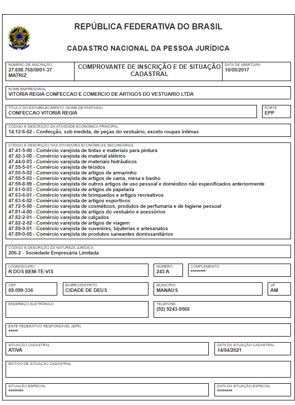 Apesar de ter como atividade principal a confecção de roupas, a empresa também está habilitada para o comércio varejista de tintas, materiais de pintura e até papelaria — o que, assim como no caso da Comercial CJ, revela um escopo de atuação extremamente diversificado e potencialmente incompatível com a natureza do negócio.