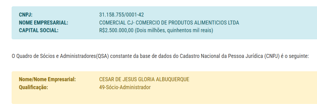 Um dos presos, César Albuquerque, é proprietário da empresa Comercial CJ – Comércio de Produtos Alimentícios Ltda., com sede no município de Presidente Figueiredo (AM). De acordo com dados da Receita Federal, a empresa está registrada sob o CNPJ 31.158.755/0001-42 e possui capital social declarado de R$ 2,5 milhões.