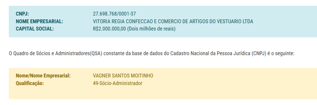 O Portal Em Tempo também apurou que Vagner Santos Moitinho é proprietário da empresa Vitória Régia Confecção e Comércio de Artigos do Vestuário LTDA, com sede no bairro Cidade de Deus, zona Norte de Manaus. Constituída em 14 de abril de 2021, a empresa tem capital social registrado de R$ 2 milhões.