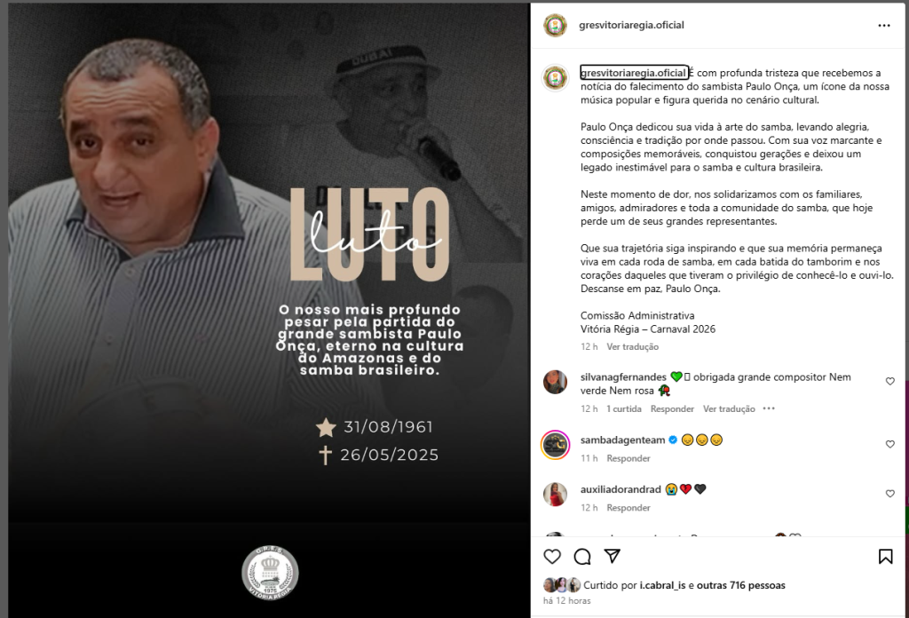 “Paulo Onça dedicou sua vida à arte do samba, levando alegria, consciência e tradição por onde passou. Com sua voz marcante e composições memoráveis, conquistou gerações e deixou um legado inestimável para o samba e a cultura brasileira”, diz o comunicado assinado pela Comissão Administrativa da escola.