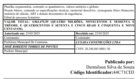 Apesar do valor elevado — R$ 4.963.475,59 — o documento oficial publicado no Diário Oficial do Município (DOM) não detalha o motivo da paralisação da obra nem especifica com clareza o que envolve o serviço de “adequações viárias”.
