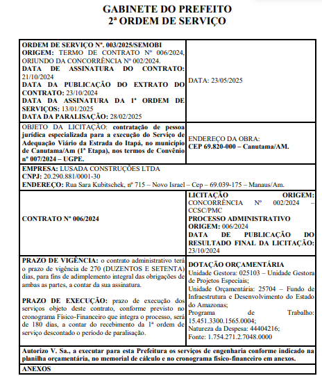 A contratação da empresa ocorreu por meio da Concorrência Pública Nº 002/2024, com resultado publicado em 23 de outubro de 2024. Dois dias antes, em 21 de outubro, a Prefeitura assinou o Contrato Nº 006/2024 com a construtora. A primeira ordem de serviço foi emitida apenas em 13 de janeiro de 2025, e as obras foram paralisadas em 28 de fevereiro. A nova ordem de serviço, datada de 23 de maio de 2025, autoriza a retomada dos trabalhos, que devem durar 180 dias, excluído o período de interrupção.