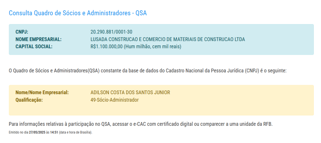O capital social da empresa é de R$ 1,1 milhão e o sócio-administrador registrado é Adilson Costa dos Santos Junior.