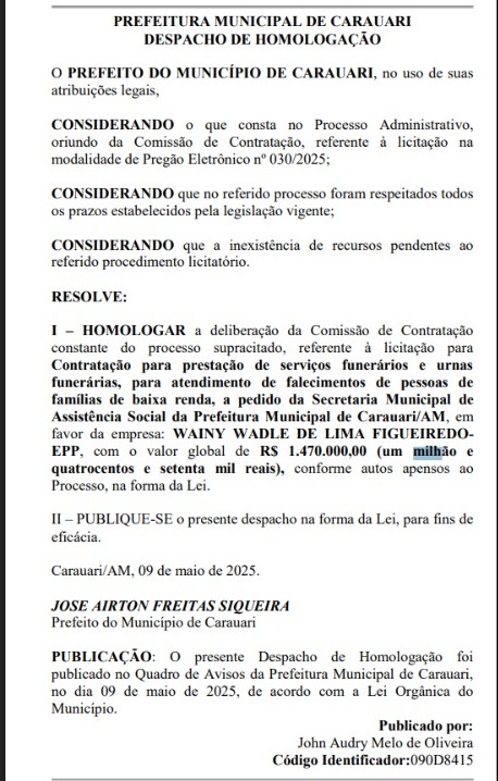 Carauari, a 789 quilômetros de Manaus, vai gastar R$ 4,6 milhões com serviços funerários, coleta de lixo e varrição. As contratações foram divulgadas no Diário Oficial da Associação Amazonense de Municípios (AAM) nesta terça-feira, dia 27.