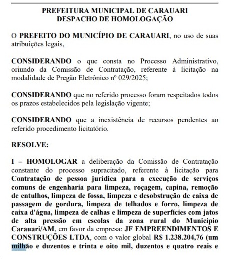 A prefeitura também publicou gastos de R$ 1,2 milhão com limpeza pública, que engloba varrição, capinação, desobstrução de caixas de esgoto, limpeza de telhados, forros, caixas d’água, calhas e remoção de entulhos. A contratada para este serviço será a JF Empreendedorismos e Construções Ltda., inscrita no CNPJ: 11.343.789/0001-08. Com sede em Manaus e capital social de R$ 1 milhão, a JF Empreendedorismos tem como atividade principal a prestação de serviços de alvenaria, segundo a Receita Federal.