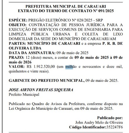 Os acordos, firmados sob a gestão do prefeito Airton Siqueira (MDB), são resultado de um pregão realizado em 9 de maio. O maior montante, no valor global de R$ 1,9 milhão, será destinado à coleta de lixo.