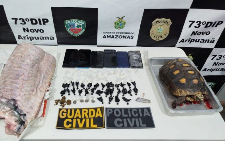 “No imóvel, localizamos porções de maconha, oxi, cocaína, quatro celulares, carne de pirarucu e um jabuti em situação de maus-tratos, o que agravou ainda mais a situação do suspeito”, relatou o delegado.
