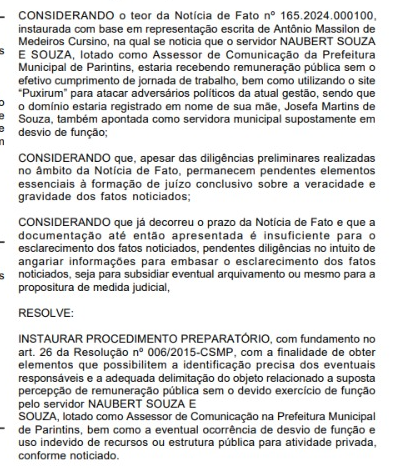 O Ministério Público do Estado do Amazonas (MPAM), por meio da 3ª Promotoria de Justiça de Parintins, instaurou procedimento preparatório para apurar possíveis irregularidades envolvendo o servidor Naubert Souza e Souza, atualmente lotado como Assessor de Comunicação da Prefeitura Municipal de Parintins.