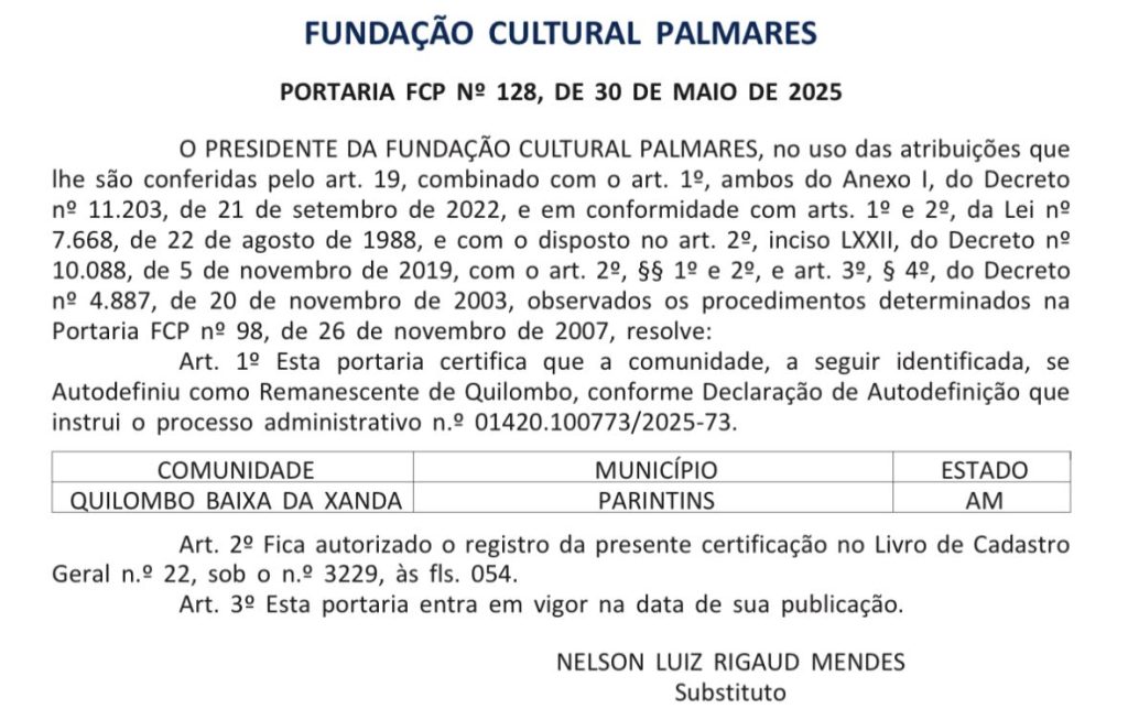 A Baixa da Xanda, local onde nasceu o Boi-Bumbá Garantido, foi oficialmente reconhecida como comunidade quilombola pela Fundação Cultural Palmares. A certificação foi publicada no Diário Oficial da União nesta sexta-feira (6) e marca um momento histórico para o movimento negro e indígena no Amazonas.