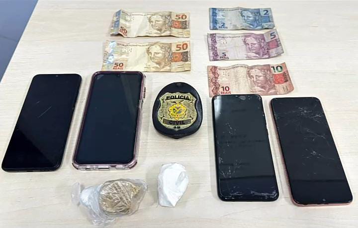 Durante a abordagem, os policiais encontraram com o suspeito quatro celulares, duas porções de cocaína e dinheiro em espécie, o que resultou também na prisão em flagrante por tráfico de drogas.