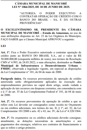 A autorização foi publicada no Diário Oficial Eletrônico dos Municípios do Estado do Amazonas (AAM) nesta sexta-feira (13). Com a aprovação da Lei nº 1066/2025 no Legislativo, a prefeitura deve receber o crédito milionário do Fundo Municipal de Infraestrutura e Desenvolvimento Urbano (FMIDU).