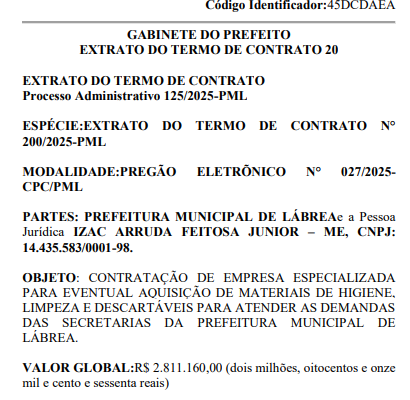 A Prefeitura do município de Lábrea, a 714 quilômetros de Manaus, vai gastar R$ 2.811.160,00 para a contratação de uma empresa especializada na aquisição de produtos de higiene e limpeza. O contrato de licitação será firmado a partir de Pregão Eletrônico.